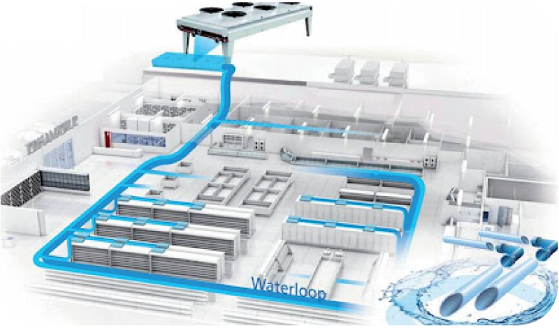 The water loop system is a closed water loop system that removes the heat of condensation generated by the water cooled condensing unit. The water circuit carries heat away from the plate heat exchanger to the cooling tower or dry cooler. Then the dry cooler or cooling tower transfer the heat to the air. Water Loop systems can offer high efficiency and energy savings, with a more precise and stable temperature control. Installations of the system could be quicker and have lower maintenance costs. Less refrigerant is needed with less leaks on the system